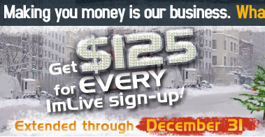 The most profitable year in ImLive's history ImLive is about to go out with a bang. ImLive is still in the midst of a massive traffic explosion, and the largest webcam arena on the net is sharing the profits with you. Due to ImLive's AMAZING success rate, and thanks to all of the webmasters who pushed the hell out of their traffic, PussyCash has decided to make this winter our most generous yet, with massive payouts for every ImLive sign-up. Send your traffic to ImLive and continue getting $125 for EVERY single ImLive sign up you send in December!